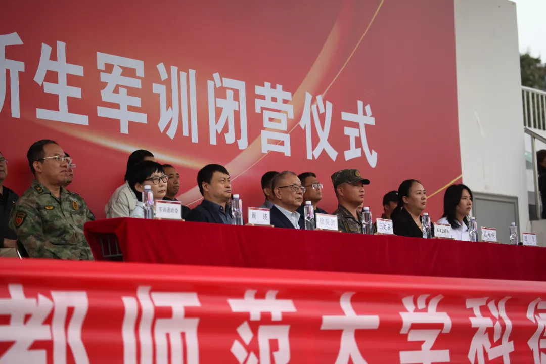 秋高气爽,丹桂飘香。2025年9月19日上午8时,首都师范大学科德学院2025级学生军训闭营仪式在学校操场隆重举行。首都师范大学科德学院校长王万良,党委书记兼常务副校长徐振剑,党委副书记、副校长陈永侠,副校长周瑛,校长助理赵飞,学生处处长、军训团政委刘克光,驻训部队领导、军训团团长还有各部门、各二级学院领导、承训部队教官、军训团全体成员共同出席了这一庄严而热烈的仪式。此次仪式由团委书记、军训团副政委王泰森主持。