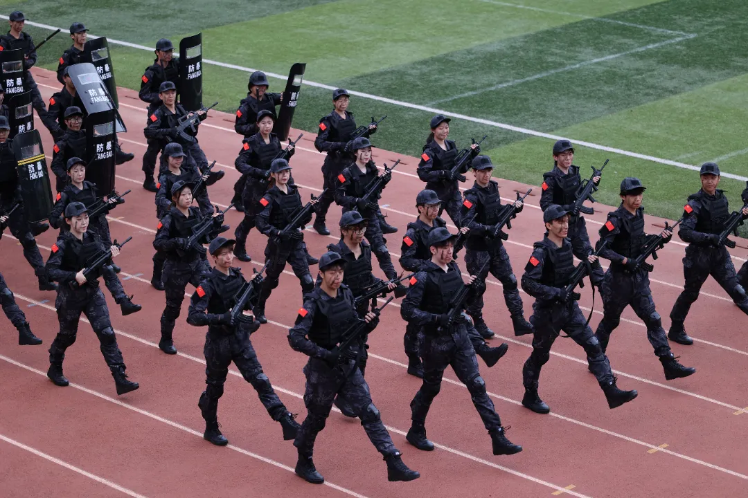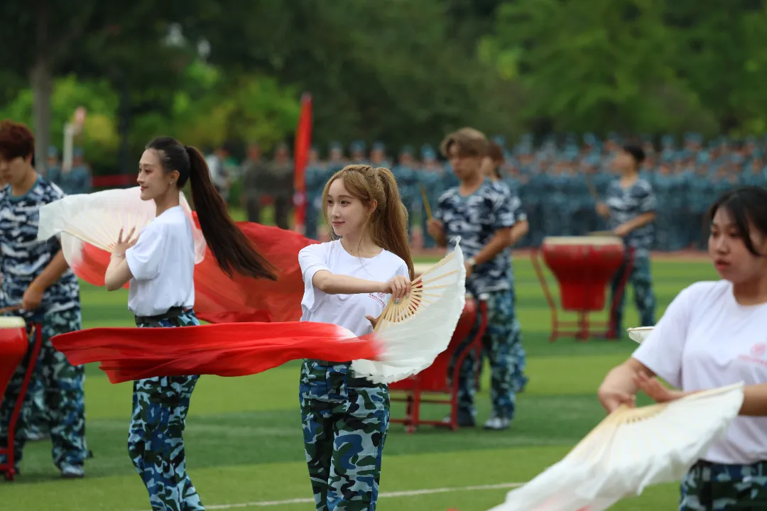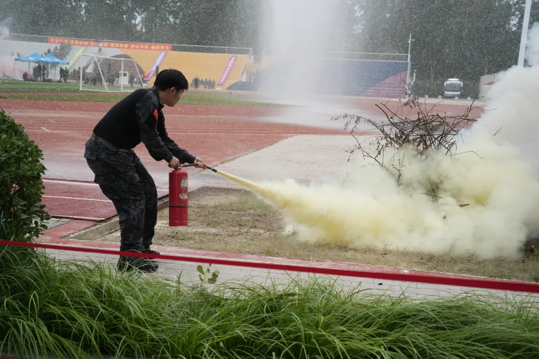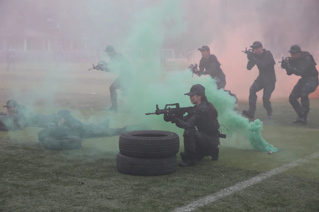随后进行的军训汇报科目表演更是精彩纷呈。同学们表演了军体拳、千人舞、消防演练等项目,动作精准,配合默契,展现了良好的军事素养和顽强的拼搏精神,同时将“安全第一”的理念深深根植于心。