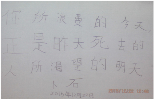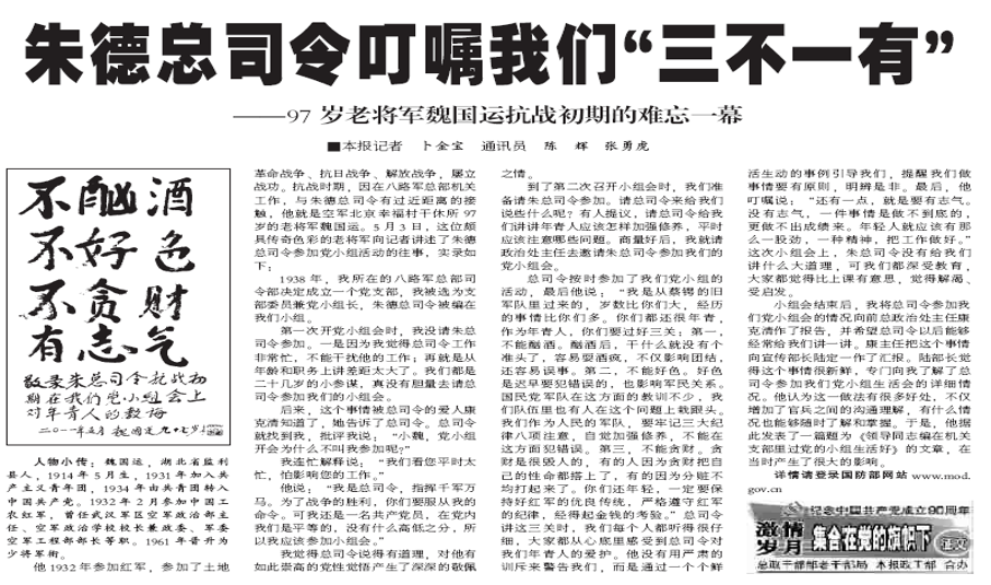 敬业,是积极进取的人生和工作态度。卜大校给同学们介绍了开国将军魏国运的故事。抗战时,八路军总部作战参谋魏国运因组织党小组生活与朱德总司令结下深刻渊源。朱德曾勉励年轻参谋们过好“三关”——不酗酒、不好色、不贪财,并叮嘱“要有志气,珍惜时光”。这番话被魏国运铭记终生,他以“三不一有”自勉,97岁时仍亲笔题写此语,托人传递青年。