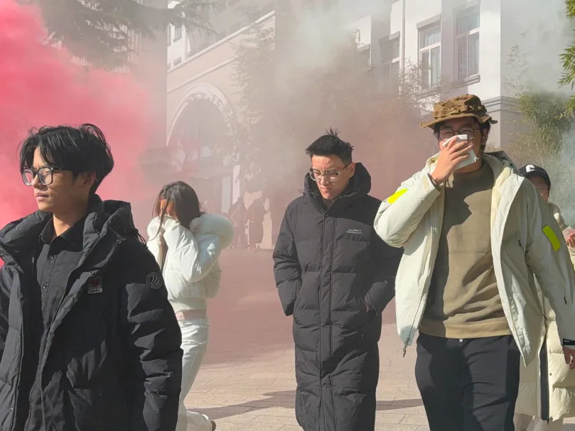 应急疏散演练中,师生严格遵循预案要求,弯腰捂鼻、快速有序撤离至指定安全区域,整个过程衔接顺畅、配合默契,有效提升了突发事件应急响应与协同处置能力。