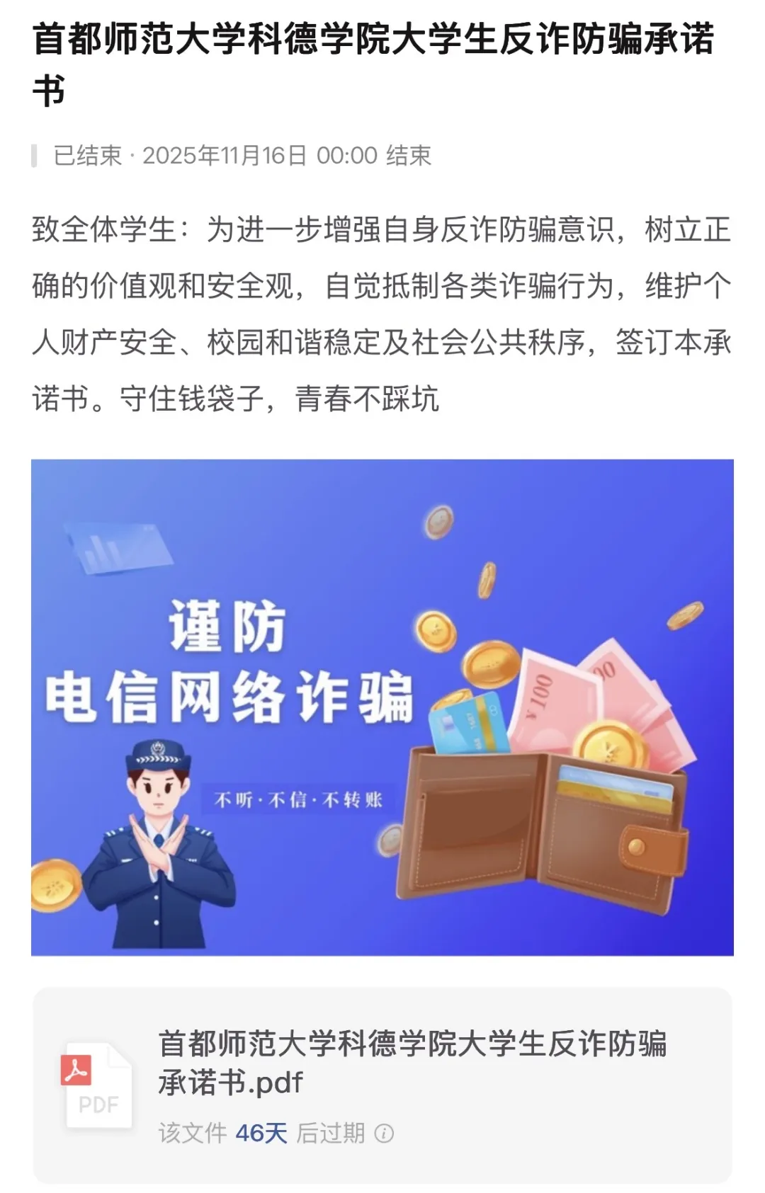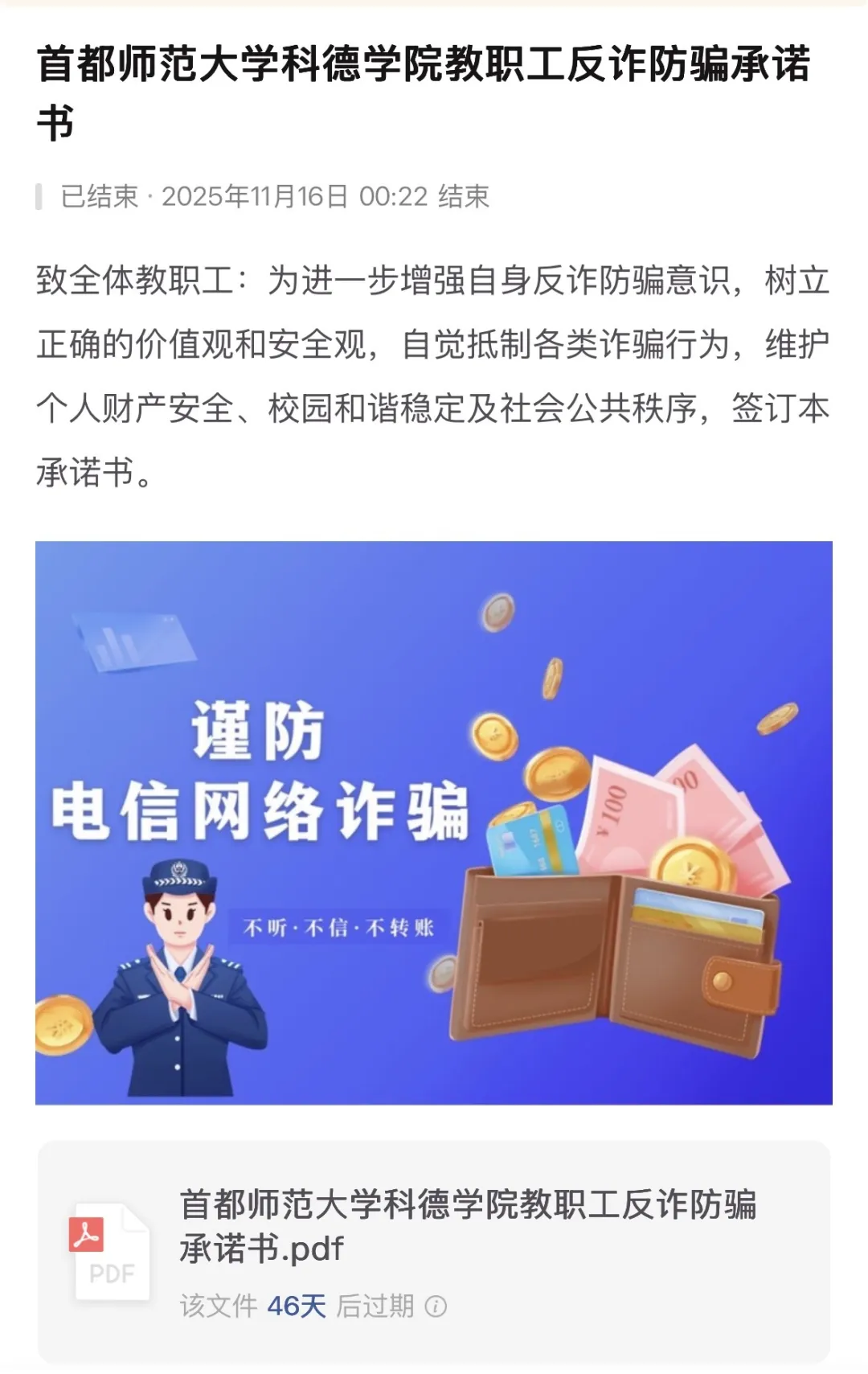 为深化反诈防骗教育成效,筑牢校园反诈防线,学校同步组织全校师生签订反诈防骗承诺书,引导师生进一步强化自身反诈防骗意识,树立正确的价值观与安全观,自觉抵制各类诈骗行为,以个人责任落实守护自身财产安全,共同维护校园和谐稳定及社会公共秩序,形成“全员反诈、共筑防线”的良好局面。