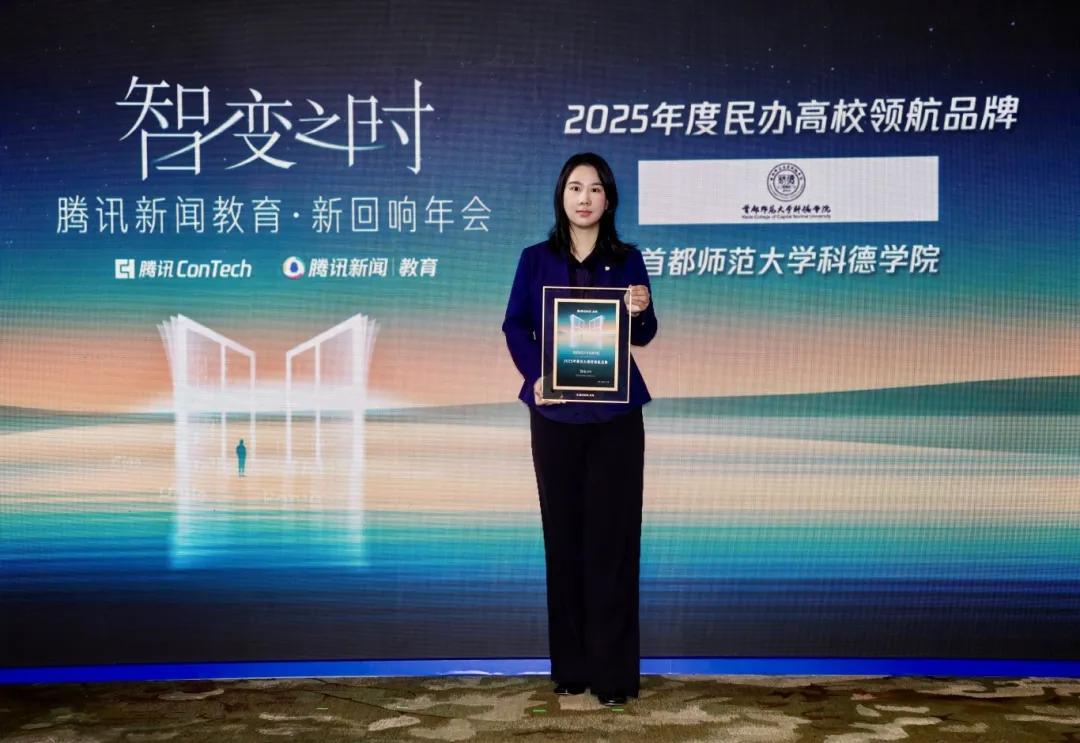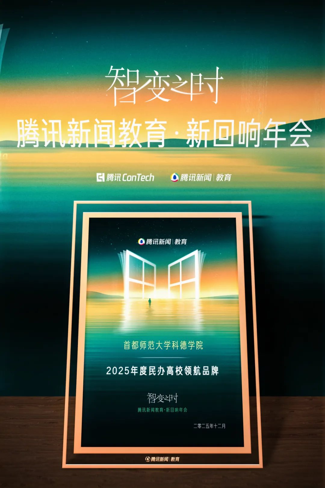 12月5日,2025腾讯新闻教育·新回响年会在北京成功举行。本届论坛以“智变之时”为主题,汇聚教育界专家学者、行业精英、研究机构、教育媒体与投资人等。共探AI浪潮下教育范式转型路径,深挖智能技术重塑教与学的核心潜能,远瞻人机协同对未来人才培养的深远价值,为教育数字化升级谋篇布局、注入动能。首都师范大学科德学院,以创新多元的育人模式为核心,以深厚坚实的师资根基为支撑,以深度融合的国内外优质教育资源为纽带,凭借在应用型创新人才培育与教育行业创新发展中的卓越实践与突出贡献,荣膺“2025年度民办高校领航品牌”荣誉称号。