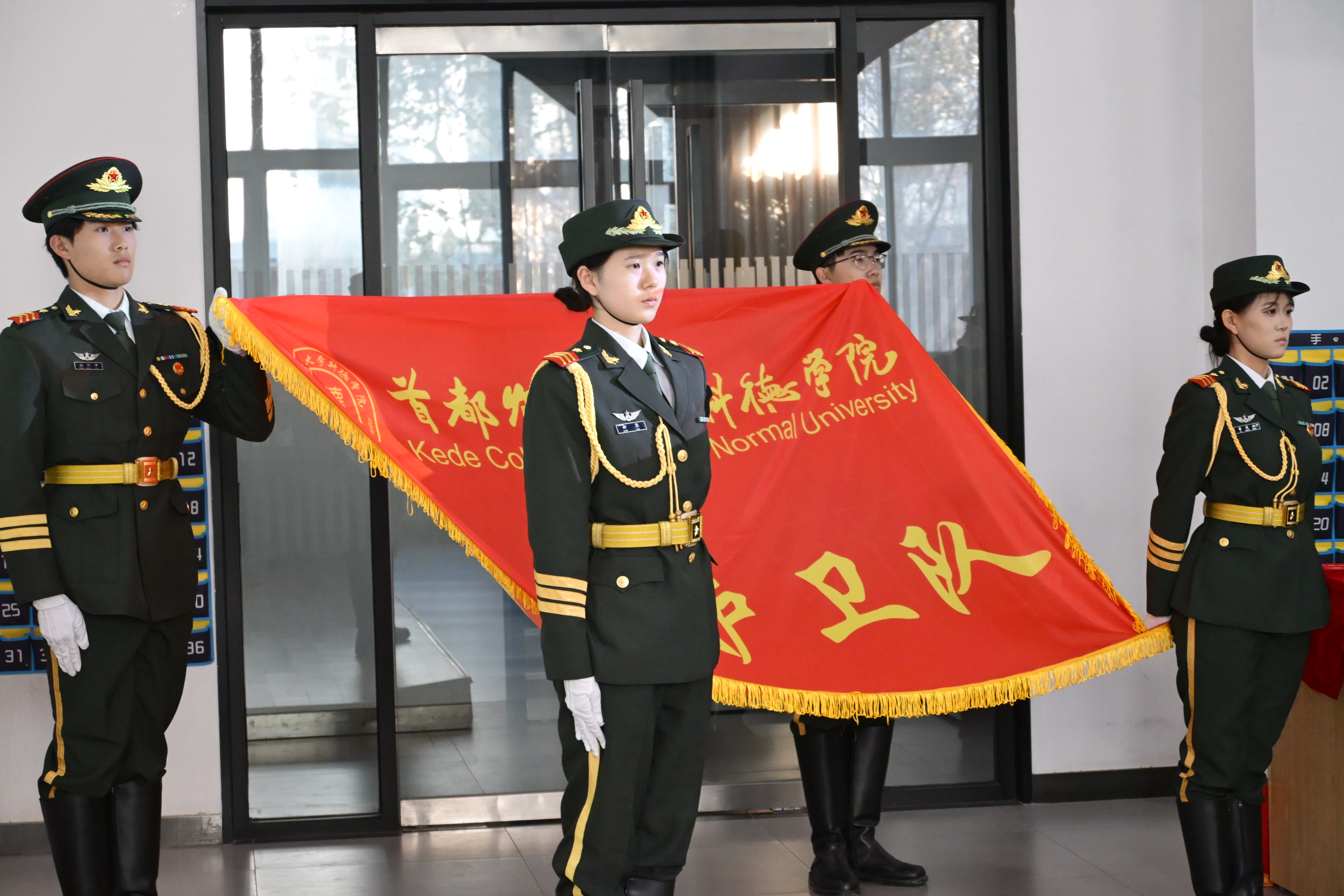 为表彰先进典型、吸纳新鲜血液,持续深化校园爱国主义教育,12 月 11 日中午,首都师范大学科德学院国旗护卫队总结表彰暨迎新大会在第一教学楼 1101 教室隆重举行。学生处处长刘克光、继续教育学院院长刘永春、传媒学院团总支书记白媛媛、艺术设计学院团总支书记韩立冬、团委书记王泰森、智能科学与技术学院团总支书记乔凤阳、学生处王晨老师,国旗护卫队指导教师黄春雨、王忠奎及全体队员、学生代表参加活动。由于早已确定会议日程,无法亲临现场参会的校长王万良,党委副书记兼副校长陈永侠,副校长周瑛,校长助理赵飞,后勤处处长王宝军,副处长马增友,特意送来祝福。