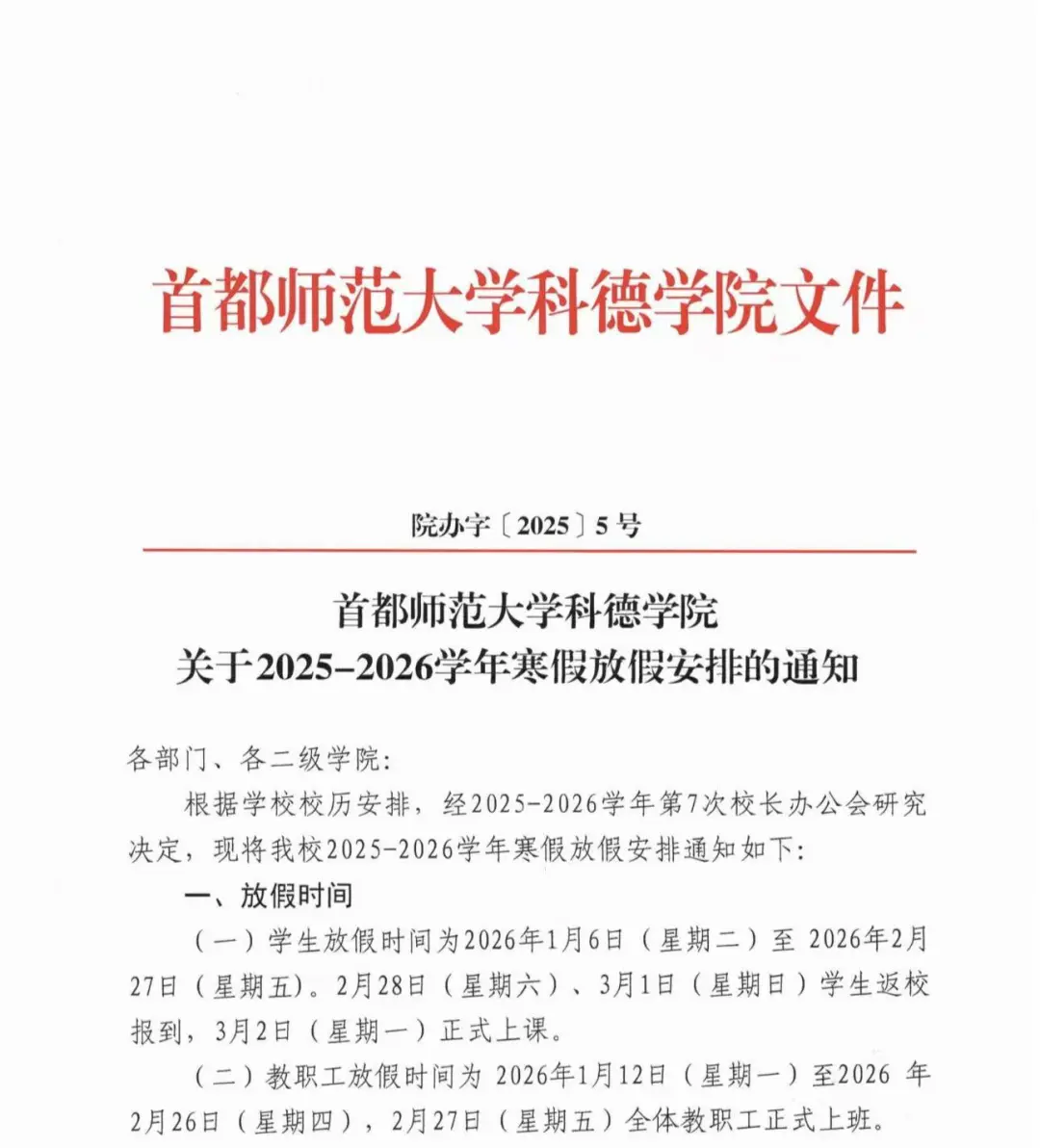 根据学校校历安排,经2025-2026学年第7次校长办公会研究决定,现将我校2025-2026学年寒假放假安排通知如下: