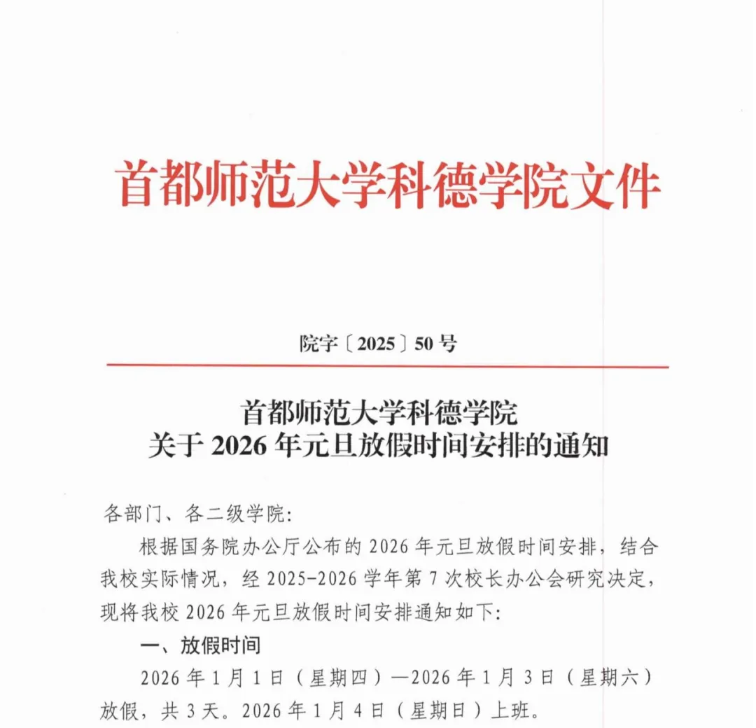 根据国务院办公厅公布的2026年元旦放假时间安排,结合我校实际情况,经2025-2026学年第7次校长办公会研究决定,现将我校2026年元旦放假时间安排通知如下: