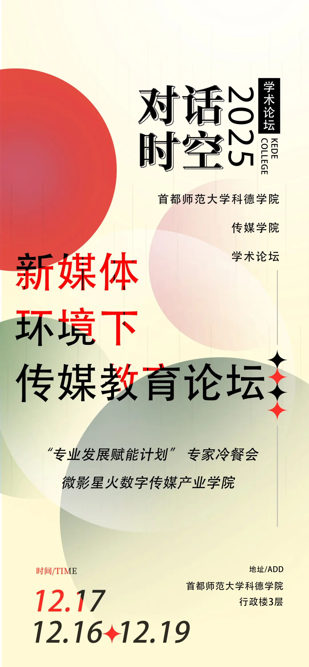 冬日暖阳映校园,学术薪火永相传。2025年12月17日,首都师范大学科德学院传媒学院主办的“新媒体环境下传媒教育论坛”系列活动在学院多功能报告厅及各专业实训场地圆满举办。本次论坛紧扣“新媒体赋能传媒教育革新,跨界融合驱动人才培养升级”的核心主题,以各专业特性为依托,精准搭建分论坛交流载体,全面覆盖戏剧影视导演、摄影、音乐、舞蹈、表演、播音与主持艺术、网络与新媒体等艺术类专业,为全院师生打造了一场兼具学术深度、实践温度与行业广度的交流盛宴。