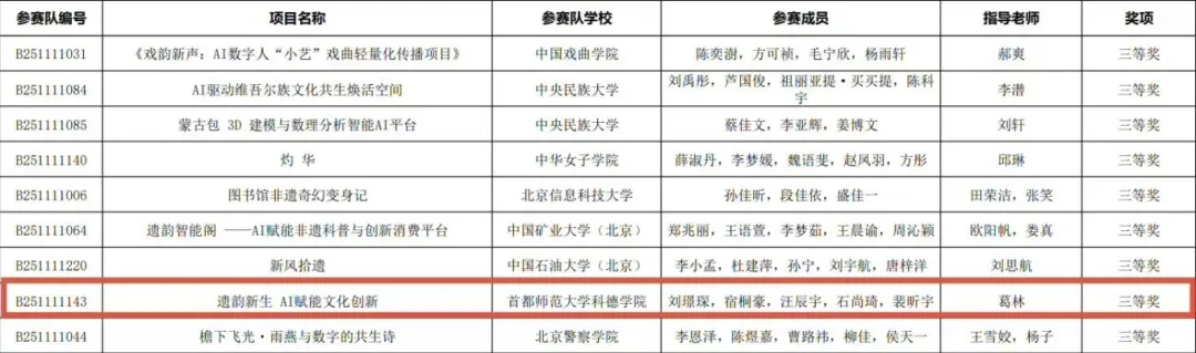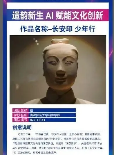 近日,以“创享青春、智启未来”为主题的首届北京市大学生“人工智能+”创新大赛在北京工业大学奥运场馆圆满落幕。首都师范大学科德学院智能科学与技术学院葛林老师带领刘璟琛、宿桐豪、汪辰宇、石尚琦、裴昕宇五位同学组成的参赛团队,创作的《遗韵新生AI赋能文化创新》项目荣获大赛三等奖,用科技创新为中华优秀传统文化传承注入青春活力。