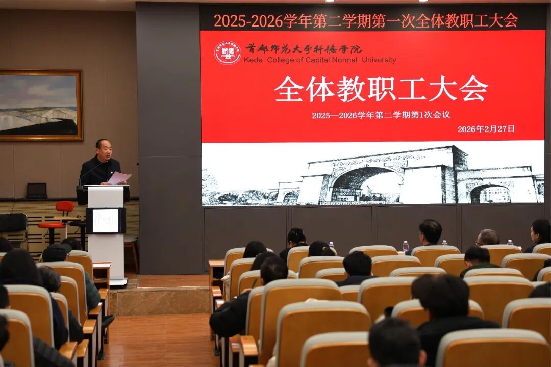 为统一思想、明确任务、压实责任,全面部署新学期各项重点工作,2月27日,首都师范大学科德学院召开2025-2026学年第二学期第一次全体教职工大会。学校董事长李宝山,校长王万良,党委书记许虎,党委副书记、副校长陈永侠,副校长赵飞,校长助理曹恰出席会议,全体教职工参加会议。会议由许虎书记主持。